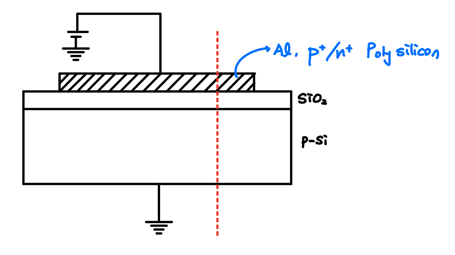 이번 포스팅 에서는 이러한 MOS 구조에 대해 에너지 밴드 다이어그램을 그려보겠습니다. 단면은 아래 그림과 같이 잘라낸 단면입니다.