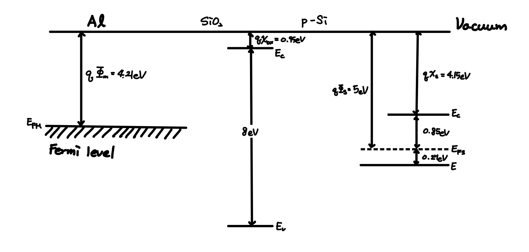 지금까지 본 에너지 밴드 다이어그램은 Al, SiO2, Si가 모두 떨어져있을 때를 그린 것입니다. 이제부터 만약 이 세 물질을 붙인다면 어떤 Diagram이 될 것인가를 보도록 하겠습니다.
