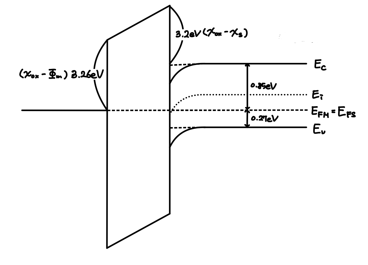가정에 의해서 MOS 구조 전체의 Fermi Level이 일정하고, 각 층간 Schottky Barrier Height가 3.26eV, 3.2eV로 일정할 것입니다. 또한 각 층을 접합한다고 해서 p type Si의 도핑 농도는 일정합니다. 따라서 MOS의 Fermi Level을 기준으로 $E_v$는 0.27eV 아래 $E_c$는 0.85eV위에 존재할 것입니다. 하지만 이 때, Metal과 Si의 Fermi Level을 맞추기 위해 Si의 Fermi Level을 올려주어야 합니다. Si의 Fermi level이 올라오면 Si의 Conduction Band Edge와 Valence Band Edge가 모두 올라가게 되겠죠? 그러면서 SiO2와 Si의 접합하는 부분이 휘게 됩니다.