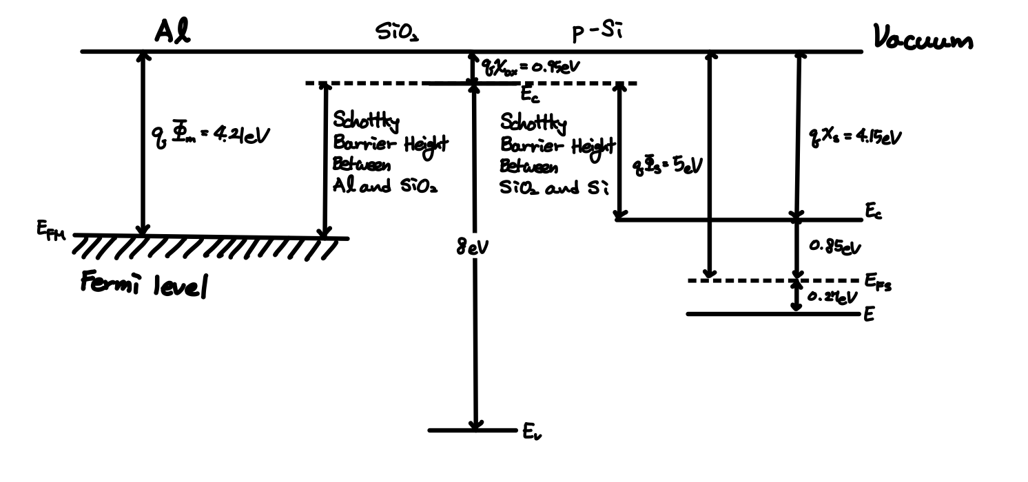 여기서 알아야할 것이 Metal의 Fermi Level 그리고 SiO2의 Conduction Band Edge 사이의 간격을 Schottky Barrier Height Between Al and SiO2라고 합니다.또한 SiO2의 Conduction Band Edge와 Si의 Conduction Band Edge 사이의 간격을 Schottky Barrier Height Between SiO2 and Si라고 합니다. 이것을 다시 그림에 나타내보면 아래의 그림과 같이 될 것입니다.