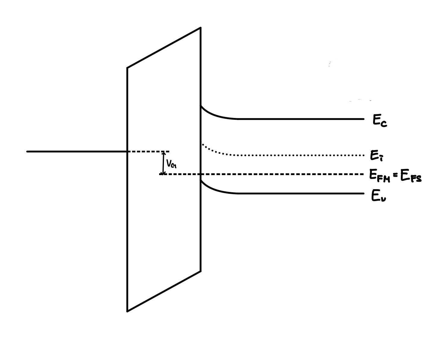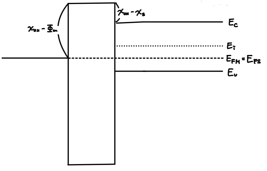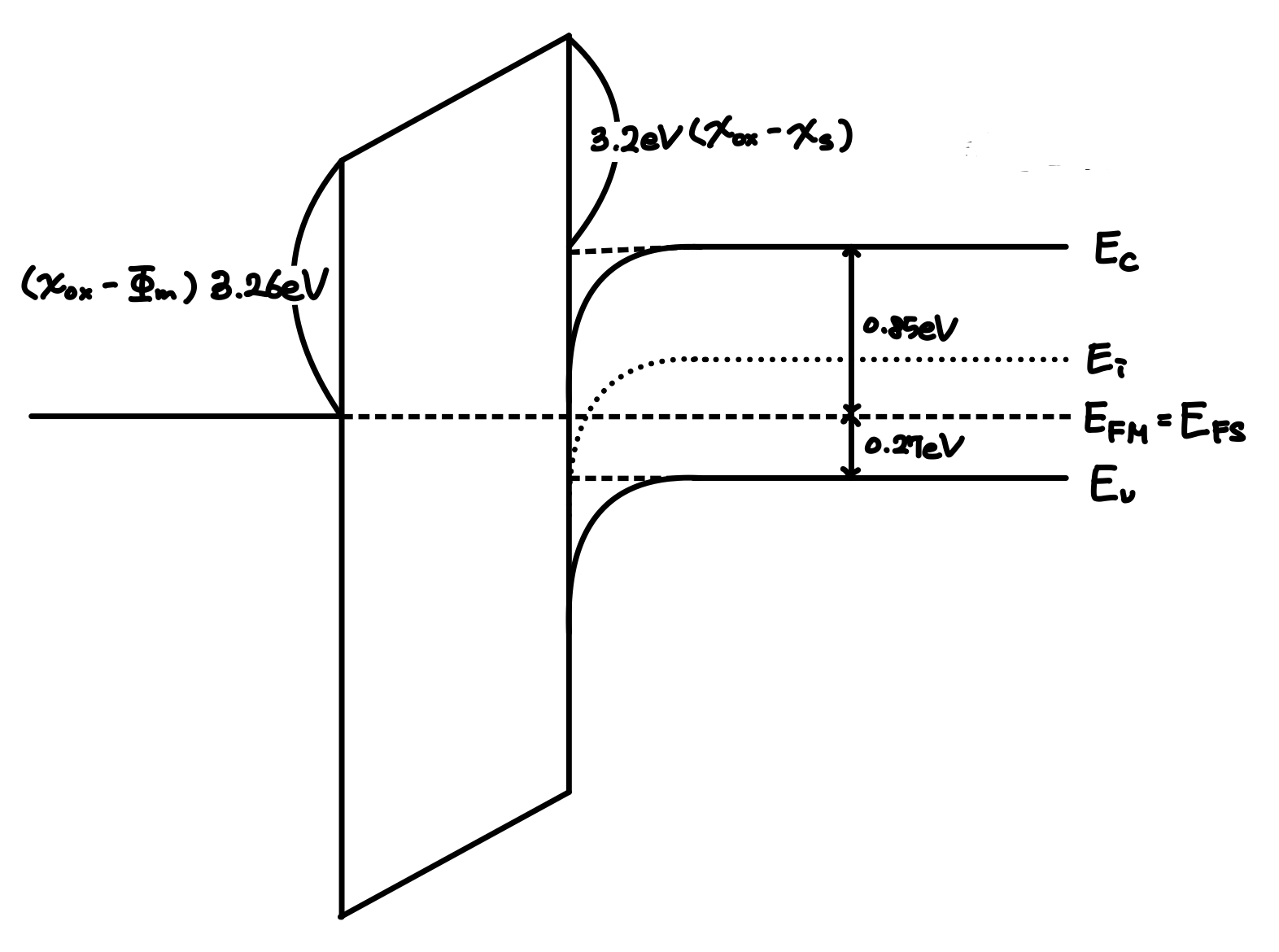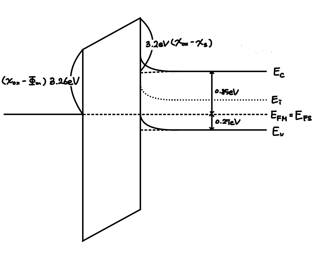 지난 포스팅에서는 Thermal Equilibtium 일 때 에너지 밴드 다이어그램을 살펴보았습니다. 그래서 각 층의 schottky Barrier Height가 일정하게 유지되고 Fermi Level이 일정하게 존재한다는 가정 하에 에너지 밴드 다이어그램을 그렸더니 실리콘과 Oxide사이의 계면 부분이 아래로 굽어지는 모습을 관찰했습니다.