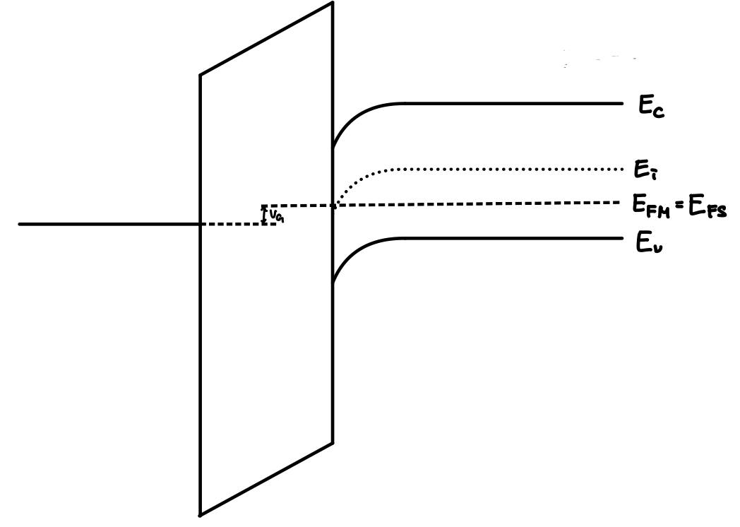 하지만 에너지 밴드 다이어그램은 전자 기준이기 때문에 q가 $-1.6 * 10^19$ 입니다. 따라서 걸어준 전압과 에너지는 반대의 부호를 갖는 것을 알 수 있습니다. 즉, Gate에 음의 전압을 걸게되면 Metal의 에너지 밴드가 올라갈 것이고, 양의 전압을 걸면 Metal의 에너지 밴드가 내려갈 것입니다.