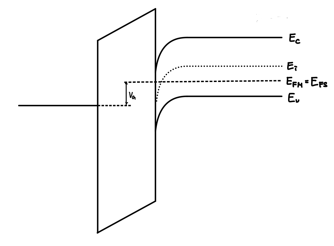 그렇다면 여기서 Conduction Band와 Valence Band가 아래로 굽는 이유가 무엇일지 생각해봅시다. 굽어지는 원인을 제공한 것은 Metal과 Silicon의 Fermi Level이 따로 떼어놨을 때 Silicon이 더 낮기 때문에 Metal과 Fermi Level을 일직선에 놓으려고 하다보니 위로 올라가죠. 그러다보니 interface가 아래로 굽을 수 밖에 없었던 겁니다. 즉, Si의 Fermi Level에 의해 에너지 밴드의 굽는 정도가 결정된다는 것입니다.