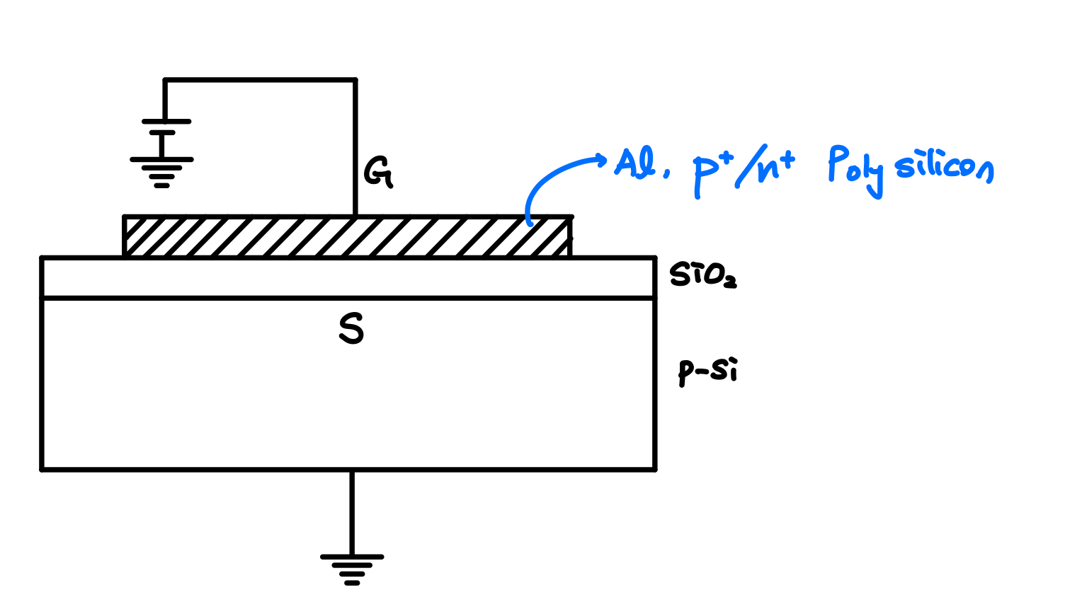 자세한 내용으로 들어가기 앞서 용어를 하나 정리하고 넘어가자면, MOS 구조에서 우리가 전압을 가하는 부분을 Gate라고 부릅니다. 아까 전압을 가할 때 어디다 가한다고 했죠? 네. Metal에다가 가했죠. 따라서 MOS 구조에서는 Gate와 Metal은 같은 부분을 지칭하는 말이 됩니다. 단면도를 그려보게 되면 Fig. 5와 같이 그려지게 됩니다.