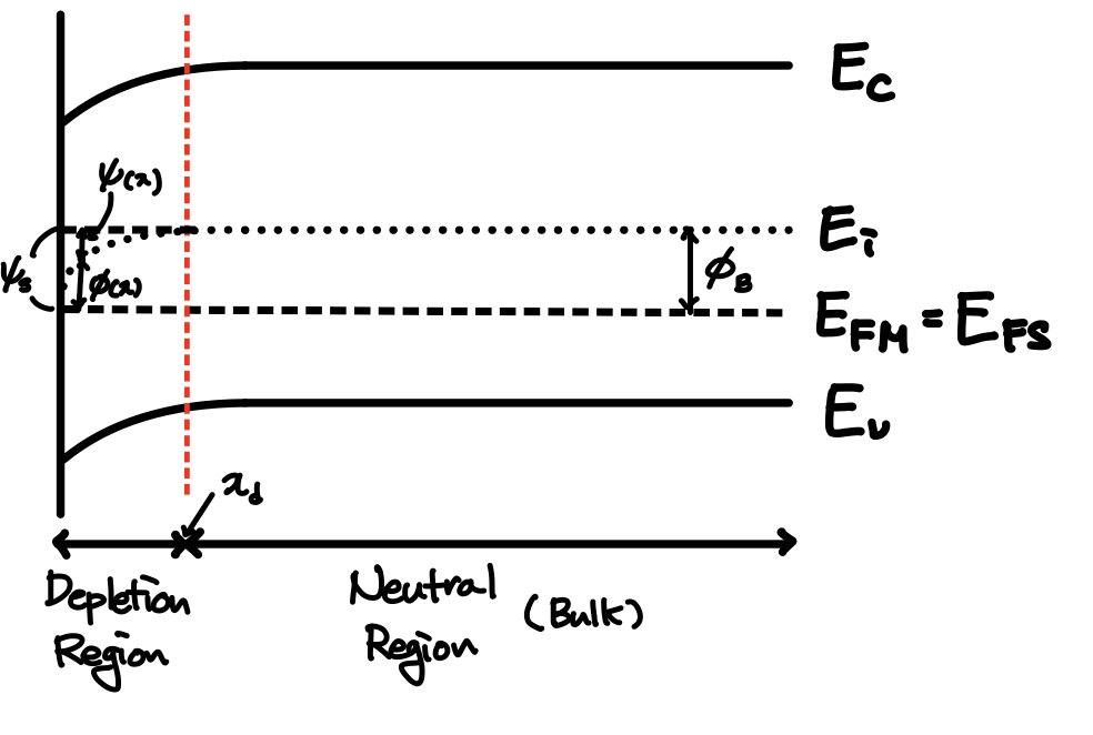 여기까지가 PN 다이오드를 공부하며 유도했던 식입니다. 그런데 PN 다이오드와는 다르게 MOS 구조에서는 Depletion Region에서 에너지 밴드가 굽는 현상이 발생합니다. 그렇기 때문에 PN 다이오드에서 사용하는 Electrostatic Potential $\Phi$는 MOS 구조에 적용할 수는 있지만 그렇게 편리한 변수는 아닙니다. 이것을 보완하기 위해 MOS 구조에서는 $\Psi$라는 변수로 Electrostatic Potential을 새롭게 정의합니다.