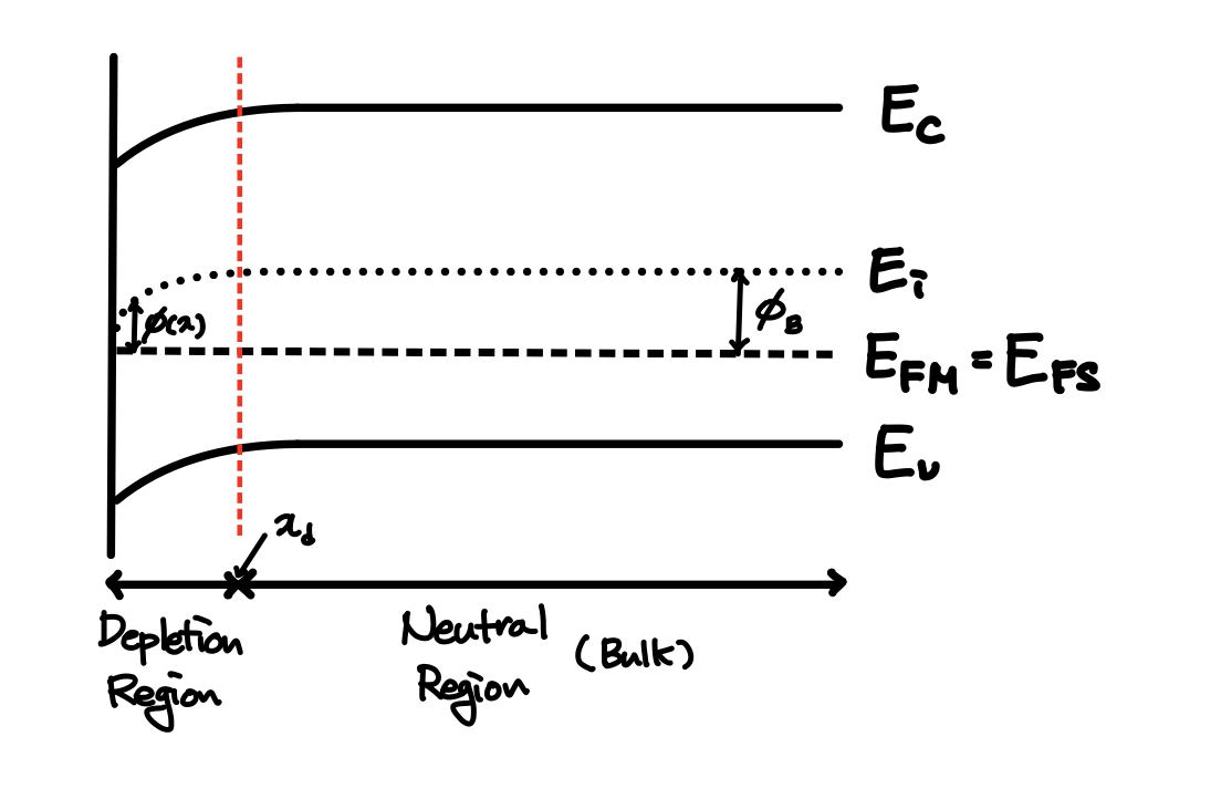 Neutral Region에서 Electrostatic Potential은 $Φ_B$라고 합시다. 이렇게 구분해서 부르는 이유는 Depletion 상태일 때는 밴드가 점점 휘면서 계면에 접근함에 따라 Electrostatic Potential Φ(x)이 변하지만 Neutral Region에서는 Band가 굽지 않기 때문에 Electrostatic Potential $\Phi$가 일정하기 때문입니다. 이 때 $Φ_B$는 Neutral Region에서 정의되기 때문에 Fermi Level $E_F$에 의해 결정됩니다. 이것은 $\Phi_B$가 Si 기판의 Doping 농도에 의해 결정된다는 것을 의미합니다. 따라서 다음과 같은 식을 통해 계산할 수 있습니다.
